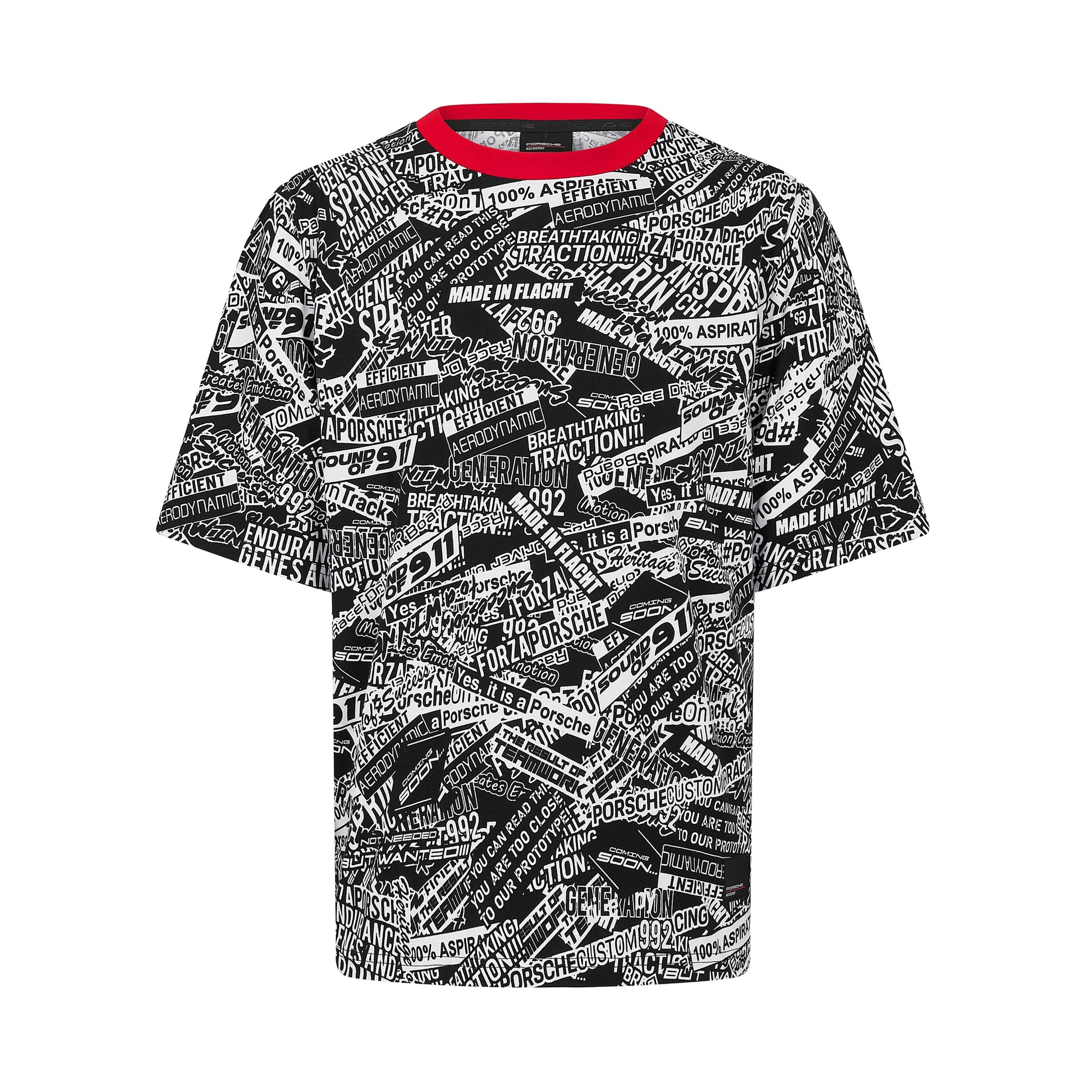 All over print oversized tee shirt from Porsche Motorsport. Bold quoted print tee with small Porsche Motorsport label on the front hem. Made from 100% Organic Cotton