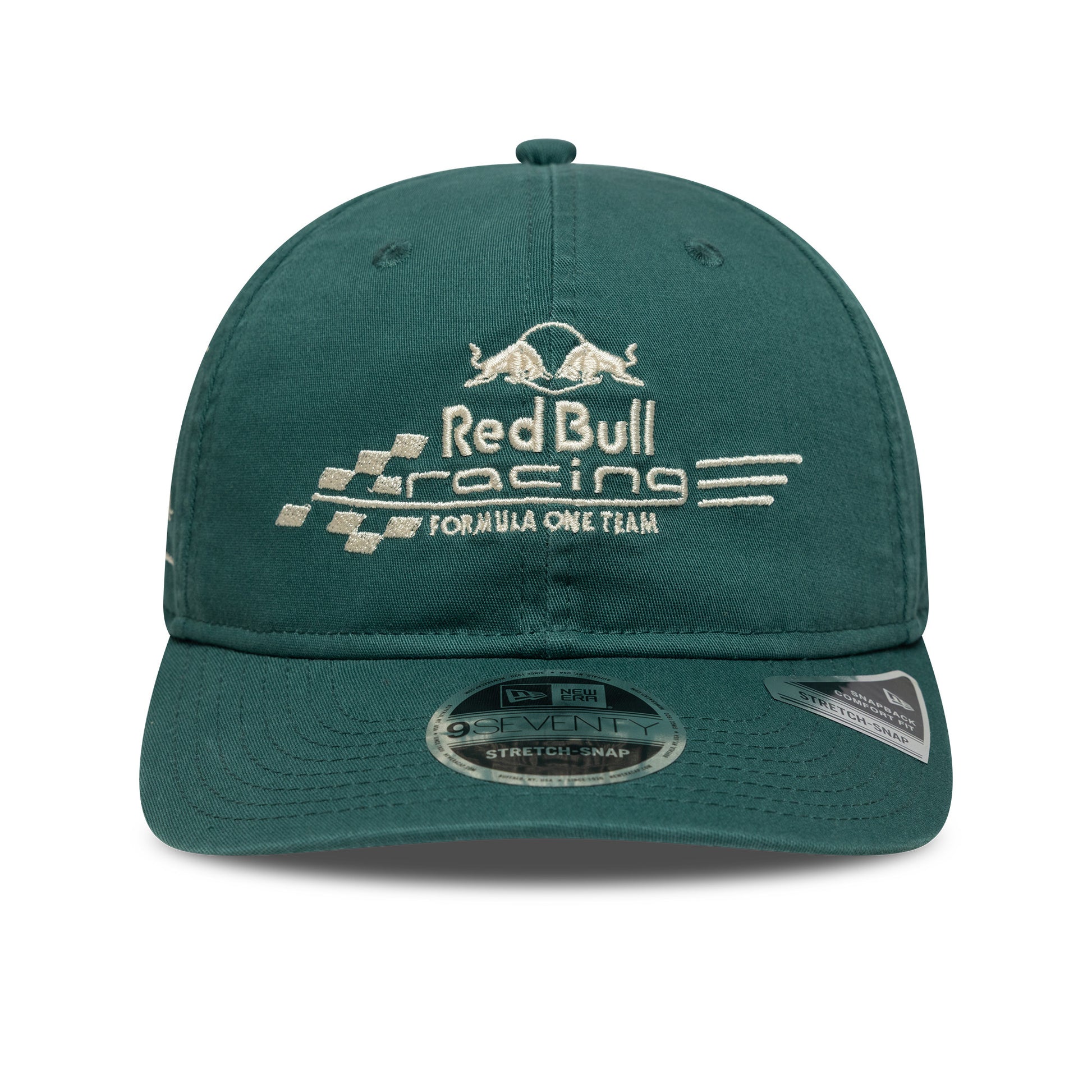 The Red Bull Racing F1 Washed 9Seventy Stretch Snap Cap – Dark Green combines laid-back style with motorsport heritage.