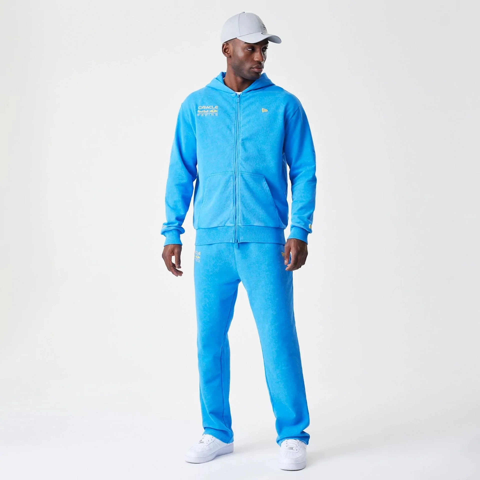 Bright blue Red Bull Racing hoodie with team graphic and zip front. Casual attire for the budding Oracle Red Bull Racing fan.